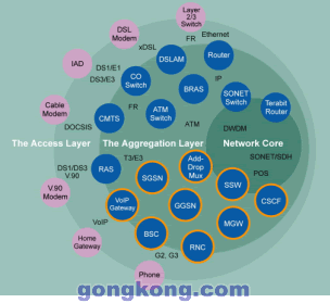 電信應用的范圍如圖2所示,從終端設備到接入層和匯聚層乃至核心網,藍色區(qū)域標出的應用可以有效地運用基于開放標準的技術,例如基于ATCA和PICMG2.16標準。