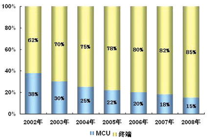 一般來說,終端和MCU是視頻會議系統(tǒng)產(chǎn)品最為關(guān)鍵的部分。計世資訊(CCW Research)的研究表明:近年來,終端的銷售比例持續(xù)增長,而MCU的銷售比例則相應萎縮。2005年,終端和MCU的比例分別為78.0%和22.0%。