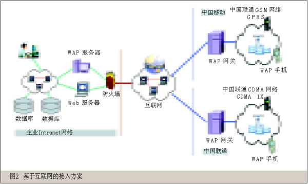 企業(yè)應(yīng)用系統(tǒng)要支持WAP應(yīng)用必須與中國移動(dòng)和中國聯(lián)通的移動(dòng)網(wǎng)絡(luò)建立連接。根據(jù)應(yīng)用的安全性要求和數(shù)據(jù)流量,有以下兩種接入方案可供選擇。