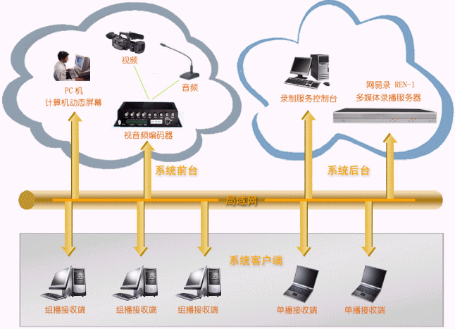 - 系統(tǒng)后臺:連接在網(wǎng)絡(luò)上即可,接受REN-1服務(wù)器管理端發(fā)送來的系統(tǒng)管理、維護(hù)指令,并負(fù)責(zé)將系統(tǒng)前臺發(fā)送來的視頻、音頻、計(jì)算機(jī)動態(tài)屏幕進(jìn)行實(shí)時錄制和直播,它包括:網(wǎng)易錄媒體中心(REN-1),它為系統(tǒng)的核心,主要完成視頻、音頻、計(jì)算機(jī)動態(tài)屏幕的錄制和直播;