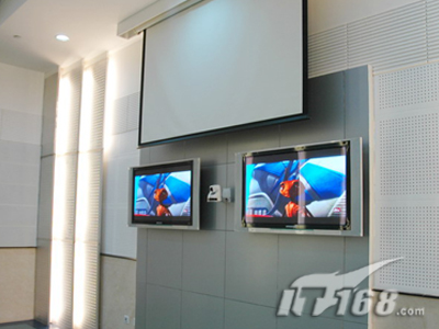 在副會場方面,和主會場區(qū)別不大,不過比主會場要光亮一點,面積也小了很多,所以主顯示系統(tǒng)只需要SONY PX40正面投影(120寸)就可以搞定。VPL-PX40可以多種方式安裝,包括桌面正投,吊頂及背投。供選購的兩款鏡頭擴(kuò)展了安裝的靈活性。中央控制開關(guān)功能讓用戶能通過中央電源開關(guān)直接開關(guān)投影機(jī)。VPL-PX40還配備了獨特的密碼認(rèn)證系統(tǒng),采用SONY液晶板的新型光學(xué)系統(tǒng),結(jié)合265W