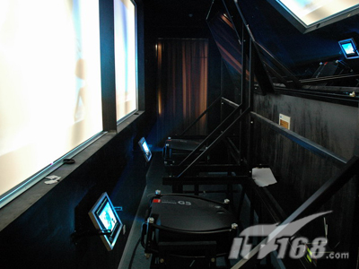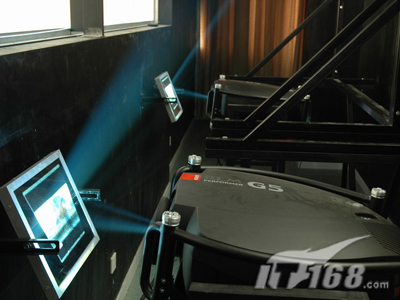 為了達(dá)到足夠大的尺寸,主屏幕采用SEAPRINE圖像控制器組成的1*2拼接,也就是采用了兩臺BARCO G5投影機(jī)來確保畫面的一流效果。不過由于投影距離的限制,這個方案里采用了二次反射系統(tǒng)。這也是這套方案的一個要點和關(guān)鍵。因為很多工程師利用一些概率來估算一次或多次折射可以縮短的投影距離,但欠缺科學(xué)和嚴(yán)謹(jǐn)?shù)膽B(tài)度,因為這個數(shù)據(jù)與屏幕安裝高度、投影方式(離軸或偏軸)、投影機(jī)體積、反射鏡面積等息息相關(guān)。