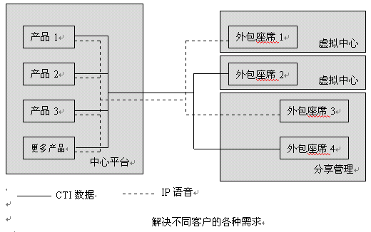 外包中心應既能服務本地業(yè)務,同時服務本區(qū)甚至全球業(yè)務,單點互連接主要為降低服務成本,共享服務資源。單點中心應具備靈活的組網(wǎng)方式,可管理客戶現(xiàn)有平臺,并具備高質(zhì)量座席向客戶提供高質(zhì)量的高端服務,同時又有解決普通客戶服務的一般座席,向客戶提供低價位的公眾服務,如下圖示意:
