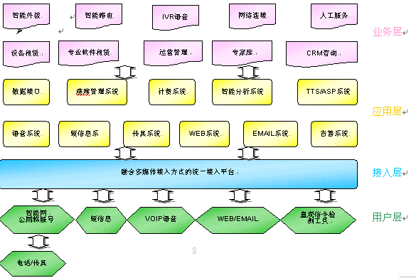 中心系統(tǒng)具備網(wǎng)絡(luò)呼叫中心及靈活的設(shè)備組網(wǎng)方式,必須使用多種媒體結(jié)合技術(shù),平臺能智能處理來自不同媒體的服務請求。多媒體包含了固定電話、移動電話、傳真、尋呼、短消息、Web、Email、視頻、PDA等多媒體。