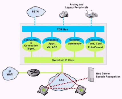 IP Enabled類IP-PBX的核心交換還是基于64K的傳統(tǒng)TDM交換網絡,由一條傳統(tǒng)TDM BUS進行控制,IP業(yè)務的支持需外接網關(可為內置插板或外置模塊),其優(yōu)點與傳統(tǒng)TDM