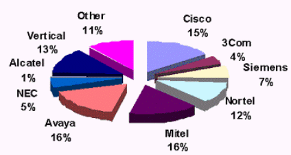 Avaya,思科和北電在上一個季度的增長率,鞏固了在中小型商業(yè)用戶市場的占有率排名第一的地位,并超過了在此領域的4個主要競爭對手(3Com,Shoretel,