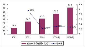 繼2004年中國政府和運營商監(jiān)管力度的加大,2005年的短信SP市場規(guī)模增長率為32%,SP市場規(guī)模55.5億元,比2004年略有上升。基于目前短信市場增量市場的縮小,其增長主要依靠對存量市場需求的深度挖掘。諾盛預(yù)計2006年的短信市場繼續(xù)保持平穩(wěn)的增長勢頭,增長率將達(dá)29%。
