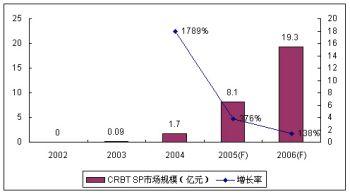 在運營商的大力推動和SP/CP的積極努力下,無線音樂市場從2004年起進(jìn)入了井噴時期。CRBT業(yè)務(wù)具有的病毒式營銷特性使得CRBT業(yè)務(wù)的滲透率增長迅速,但其時尚特性又使得業(yè)務(wù)的滲透率高峰很容易達(dá)到、業(yè)務(wù)縱深有限。2005年,CRBT的SP市場規(guī)模增長率為376%,較上一年的高速增長有所回落。諾盛預(yù)計2006年運營商和SP/CP仍然會力推CRBT業(yè)務(wù)。在產(chǎn)業(yè)鏈積極推動和用戶滲透率高峰已經(jīng)逼近的雙重制約下,諾盛預(yù)計CRBT業(yè)務(wù)的SP市場規(guī)模增長率為138%,整體SP市場規(guī)模達(dá)到19.3億元。