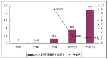 作為SP和移動運營商都非?春玫臉I(yè)務(wù),JAVA業(yè)務(wù)受到眾多SP的青睞。盡管作為JAVA主要業(yè)務(wù)的手機游戲目前盈利狀況普遍欠佳,但空中網(wǎng)、美通無線、數(shù)字魚等SP仍然大量投入,期待著未來業(yè)務(wù)的高速增長。受制于終端和JAVA游戲的表現(xiàn)力,2005年JAVA業(yè)務(wù)的SP市場規(guī)模增長率回落到200%,諾盛預(yù)計2006年JAVA的使用環(huán)境沒有太大變化,其增長率進(jìn)一步回落至144%。