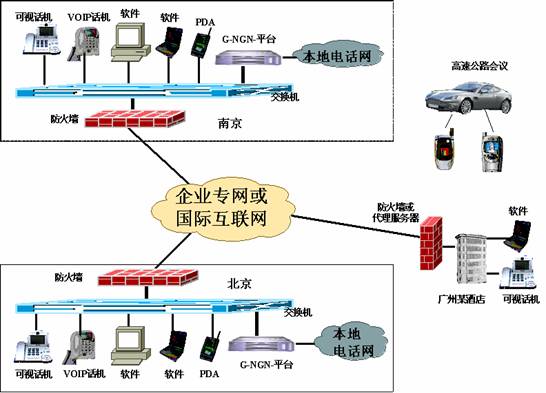 G-NGN-Softswitch產(chǎn)品可以使集團(tuán)用戶通過租用網(wǎng)絡(luò)運(yùn)營商的寬帶線路,或者直接借助國際互聯(lián)網(wǎng)組建成連接全市、全省乃至全國的集團(tuán)內(nèi)部網(wǎng)絡(luò)電話,可以提供可視話機(jī)、非可視話機(jī)、客戶端軟件、PDA等多種便捷方式實現(xiàn)集團(tuán)內(nèi)部的可視或非可視通訊。