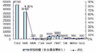 2005年包含運(yùn)營(yíng)商通信費(fèi)收入在內(nèi)的中國(guó)移動(dòng)增值業(yè)務(wù)市場(chǎng)總規(guī)模為457.4億元,其中,包括SMS、CaiE、JAVA、BREW等在內(nèi)的移動(dòng)數(shù)據(jù)增值業(yè)務(wù)市場(chǎng)規(guī)模占到總體增值市場(chǎng)規(guī)模的90%,達(dá)到411.66億元;包括IVR,CRBT等在內(nèi)的移動(dòng)語音增值業(yè)務(wù)市場(chǎng)規(guī)模為57.4億元,占總體市場(chǎng)規(guī)模的10%。
