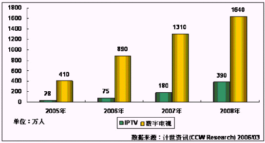 當(dāng)然,從國(guó)際上看,電信和廣電的融合是主流趨勢(shì),但從目前國(guó)內(nèi)的情況來(lái)看,由于牽扯到利益沖突,融合并非一句話的事,仍需要克服重重阻力。計(jì)世資訊(CCW Research)的數(shù)據(jù)顯示,在2005年IPTV的用戶只有僅僅28萬(wàn)人,而廣電數(shù)字電視用戶已經(jīng)達(dá)到410萬(wàn)人。相信在未來(lái)幾年內(nèi)這個(gè)比例很難有大的變動(dòng)。IPTV要想趕超數(shù)字電視還需要付出更大的努力。