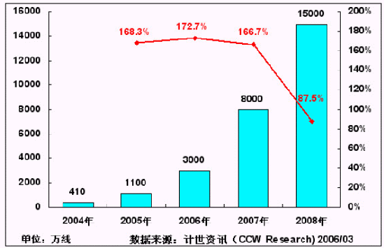 主流運營商NGN網(wǎng)絡的規(guī);ㄔO,為IP Centrex、寬帶電話等新業(yè)務在國內(nèi)的大規(guī)模應用提供了良好的支撐。計世資訊(CCW Research)預計,在未來3年內(nèi),中國的NGN網(wǎng)絡建設規(guī)模將獲得快速增長,到2008年,將有望達到1.5億線的規(guī)模。