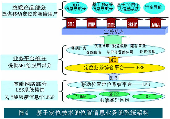 其中在基礎(chǔ)網(wǎng)絡(luò)層面中,LBS系統(tǒng)提供X、Y經(jīng)緯度信息,并把信息傳遞到定位業(yè)務(wù)綜合平臺。提供不同位置應(yīng)用的平臺部分通過接口的方式獲取位置信息,進(jìn)行面向特定業(yè)務(wù)的計(jì)算。終端用戶通過移動終端并以不同的接入方式獲取位置類的信息服務(wù)。