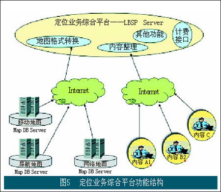在上述結(jié)構(gòu)中,定位業(yè)務(wù)綜合平臺LBSP扮演著重要角色。其功能結(jié)構(gòu)如圖5所示。在該平臺中提供位置類信息業(yè)務(wù)的業(yè)務(wù)運(yùn)營支撐功能,包括計(jì)費(fèi)功能(以及和BOSS系統(tǒng)的接口);同時(shí)該平臺還扮演著接入不同內(nèi)容開發(fā)商的重要角色。不同的內(nèi)容開發(fā)和提供商通過該平臺向最終用戶提供具體的業(yè)務(wù)和應(yīng)用,運(yùn)營商通過該平臺對不同內(nèi)容開發(fā)商提供的內(nèi)容進(jìn)行管理和整理,使面向用戶的應(yīng)用能夠順利得到展現(xiàn)。該平臺提供的另一個(gè)重要角色是肩負(fù)著接入地圖信息提供商的重任,并在該平臺中通過地圖格式的轉(zhuǎn)換使不同地圖提供商所提供的地圖信息能夠以一致的格式向用戶提供。