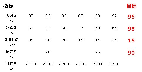 從準(zhǔn)確率的角度來看:各月指標(biāo)值都低于目標(biāo)值,處于沒有達(dá)標(biāo)狀態(tài),但從1-6月各月準(zhǔn)確率的變化情況來看,其處于一個(gè)持續(xù)改進(jìn)狀態(tài)(連續(xù)三點(diǎn)以上的上升可認(rèn)為是持續(xù)改進(jìn)),即說明通過管理控制,該指標(biāo)得到了持續(xù)改善。因此,對準(zhǔn)確率的管理是有效的,雖然目前還沒有達(dá)到目標(biāo)值。