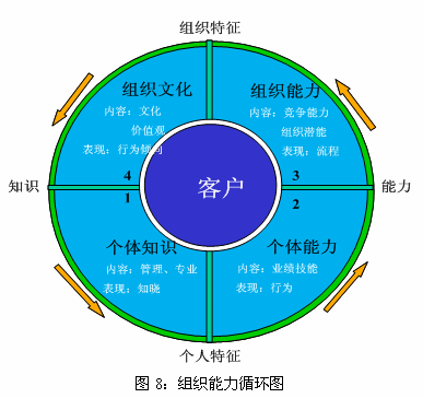組織能力循環(huán)圖說明,管理者不僅要關(guān)注對組織中個體層次特性的管理,如個體知識、個體能力,更要關(guān)注組織層次特性的管理,如組織能力和企業(yè)文化。只有管理者將目光由個體能力轉(zhuǎn)向組織能力時,即更注重組織層次的能力建設(shè)時,組織才會真正地成長和發(fā)展。