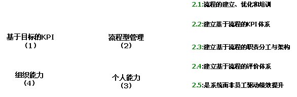 因此,要有效實施“流程型”管理,必須在我們?nèi)粘9芾淼膬?nèi)容、KPI體系、組織架構(gòu)、績效評價體系和組織發(fā)展的驅(qū)動力五個方法實施同步的轉(zhuǎn)變,才能有效建立流程文化,保證整個組織對流程的理解和重視,提高組織的執(zhí)行能力,通過“組織能力”保證組織目標(biāo)的實現(xiàn),而非依賴個體能力。
