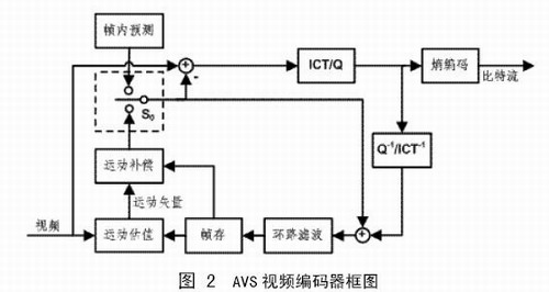 AVS視頻標(biāo)準(zhǔn)定義了I幀、P幀和B幀三種不同類(lèi)型的圖像,I幀中的宏塊只進(jìn)行幀內(nèi)預(yù)測(cè),P幀和B幀的宏塊則需要進(jìn)行幀內(nèi)預(yù)測(cè)或幀間預(yù)測(cè),圖中S0是預(yù)測(cè)模式選擇開(kāi)關(guān)。預(yù)測(cè)殘差進(jìn)行8×8整數(shù)變換(ICT)和量化,然后對(duì)量化系數(shù)進(jìn)行zig-zag掃描(隔行編碼塊使用另一種掃描方式),得到一維排列的量化系數(shù),最后對(duì)量化系數(shù)進(jìn)行熵編碼。AVS視頻標(biāo)準(zhǔn)的變換和量化只需要加減法和移位操作,用16位精度即可完成。