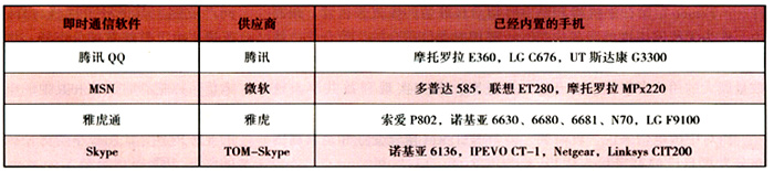 手機廠商、服務和內(nèi)容提供商都非常看好移動即時通信市場,已經(jīng)有大量的手機內(nèi)置了主流的即時通信軟件,例如采用Windows Mobile系列操作系統(tǒng)的智能手機都預置了MSN。雅虎、騰訊在推動其“移動QQ”業(yè)務時,也努力說服手機廠商內(nèi)置其軟件。內(nèi)置即時通信軟件的手機型號如表l所示。