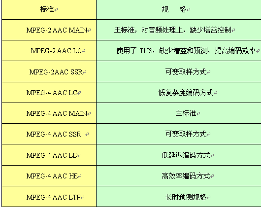 目前國際上對音頻處理技術(shù)上標(biāo)準(zhǔn)較多,在對下一代實(shí)時(shí)交互音頻處理上可以采用MPEG-1Layer2或AAC系列音頻,對選用標(biāo)準(zhǔn)的原則是,音頻頻響范圍要達(dá)到22KHz,這樣就幾乎可以覆蓋了人耳聽覺的全部范圍,甚至在高頻方面還有所超越,能夠使現(xiàn)場音頻得到真實(shí)自然的還原,并且在還原時(shí)可以采用雙聲道立體聲回放,使整個(gè)視頻通訊的聲音有更強(qiáng)的臨近感,達(dá)到CD級(jí)音質(zhì)。同時(shí)在對鏈路帶寬的適應(yīng)和編解碼效率上達(dá)到最佳。下表列出AAC的9種規(guī)格。