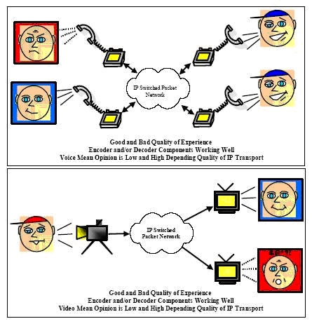 自然地,人們會向到將MOS或其它基于判斷的分值測量技術(shù)應(yīng)用于IP業(yè)務(wù)的質(zhì)量體驗(yàn)測量。對于IP業(yè)務(wù),業(yè)務(wù)提供商的控制力是有限的,攜帶語音和視頻信息的數(shù)據(jù)包進(jìn)入IP網(wǎng)絡(luò)后,IP業(yè)務(wù)提供商能做的僅僅丟棄數(shù)據(jù)包、延遲數(shù)據(jù)包或者將數(shù)據(jù)包重新排序。