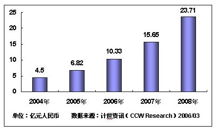 我國移動電子政務(wù)已經(jīng)進(jìn)入高速發(fā)展時期:2005年的市場規(guī)模達(dá)6.82億元,增長率為51.6%;2006年將達(dá)到10.33億元。預(yù)計未來三年內(nèi),我國移動電子政務(wù)復(fù)合增長率將達(dá)到51.5%,截至2008年,市場規(guī)模將突破20億元。