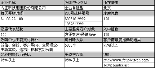 方正呼叫中心是方正服務(wù)平臺的重要組成部分,1999年建立,秉承了北大方正“勤備、嚴(yán)謹(jǐn)、求實、創(chuàng)新”的精神,依托方正科技“誠信、創(chuàng)新、客戶導(dǎo)向、全局觀念、主動高效、追求目標(biāo)和賞罰分明”的核心價值觀,以及“全程服務(wù)”的品牌文化,以“優(yōu)化服務(wù)流程,提高服務(wù)質(zhì)量,培育優(yōu)秀品牌,形成競爭優(yōu)勢,創(chuàng)新服務(wù)模式,加速業(yè)務(wù)增長”作為自己的發(fā)展目標(biāo)和方向,并學(xué)習(xí)業(yè)界先進的理念和方法,不斷探索和發(fā)展,多次受到媒體和機構(gòu)的關(guān)注。