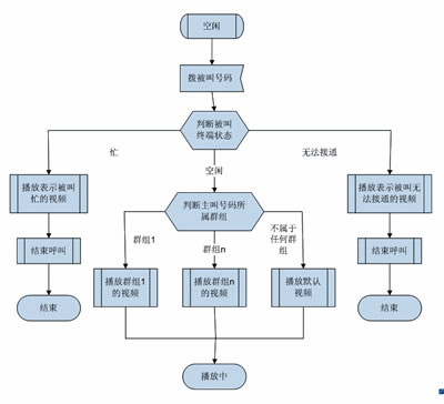 多媒體彩鈴用戶可以為某一位或某一組主叫用戶設(shè)定不同的視頻,當(dāng)某個主叫用戶來電時,系統(tǒng)根據(jù)被叫用戶的狀態(tài)和主叫所屬的群組播放不同的視頻。如果被叫忙或者無法接通,則播放能表達被叫當(dāng)前狀態(tài)的默認系統(tǒng)視頻;如果被叫空閑,則根據(jù)主叫號碼所屬的群組播放被叫為該群組定制的視頻。無論在哪種情況下,主叫都可以在手機上欣賞到精彩的視頻媒體。圖1是多媒體彩鈴業(yè)務(wù)使用流程。