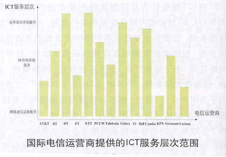 ICT服務的范圍大致可分為三個層次,一是面向網絡通信設施(包括網絡規(guī)劃、網絡系統(tǒng)集成、外包管理等)的服務,二是面向IT應用系統(tǒng)(包括軟件系統(tǒng)支持與維護、系統(tǒng)集成、應用托管等)的服務,三是面向業(yè)務流程系統(tǒng)(包括系統(tǒng)咨詢、業(yè)務流程外包等)的服務。從客戶視角來看,第三種服務的層次最高,第一種服務的層次最低,而電信運營商提供的ICT服務層次越高,則表明其在該領域拓展的范圍越廣。上述國際電信運營商提供的ICT服務層次范圍如下圖所示。