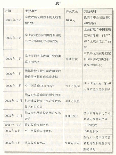 從2003年開始,國內(nèi)就顯現(xiàn)出并購增值服務(wù)運(yùn)營企業(yè)的苗頭。2004年以來,隨著整治增值服務(wù)運(yùn)營企業(yè)的力度不斷加大,并購漸成風(fēng)潮(見表1)。2004年2月,新浪收購深圳網(wǎng)興科技公司;2004年5月,搜狐收購手機(jī)WAP服務(wù)提供商北京吉菲爾公司。2005年,在“超級女生”節(jié)目大獲成功后,掌上靈通宣布將對國內(nèi)著名的九天音樂網(wǎng)進(jìn)行戰(zhàn)略投資,全面打造“中國正版數(shù)字音樂第一門戶”和“無線百老匯”品牌。各大移動增值業(yè)務(wù)服務(wù)商通過并購競爭對手,門戶網(wǎng)站可以在移動增值服務(wù)領(lǐng)域?qū)で笮碌耐黄,獲得可觀的利益,增強(qiáng)自身的競爭力。伴隨著3G商用的日益臨近和市場競爭的不斷加劇,主流SP(服務(wù)提供商)進(jìn)一步加快了資本購并和業(yè)務(wù)整合的步伐,整個(gè)SP行業(yè)將加速洗牌。經(jīng)過市場整合,主流SP將不斷做大做強(qiáng),而相當(dāng)多的缺乏市場競爭力的SP將被淘汰出局。