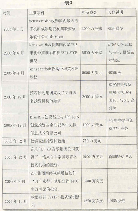 近幾年來,一些資本投資商將投資的重點(diǎn)放到了無線音樂、手機(jī)游戲和手機(jī)視訊等業(yè)務(wù)領(lǐng)域,逐步加大了對SP的投資力度(見表3)。進(jìn)入2005年以來,著眼于2.5G向3G的全面演進(jìn),風(fēng)險(xiǎn)投資對SP的投資力度進(jìn)一步加大。以滾石移動為例,在2002年和2004年獲得兩輪風(fēng)險(xiǎn)投資之后,滾石移動憑借在無線音樂領(lǐng)域取得的良好市場業(yè)績,又獲得了智基創(chuàng)投、華登國際、聯(lián)想投資等公司的投資,投資金額達(dá)3000萬美元。繼2004年10月獲得IDG投資以后,2005年12月7日,國內(nèi)著名的數(shù)字音樂門戶——A8音樂集團(tuán)獲得了包括IDG和Intel投資公司在內(nèi)的5家國際著名投資機(jī)構(gòu)的投資,投資金額達(dá)2000萬美元。同月,掌中無限則獲得了來自全球性風(fēng)險(xiǎn)投資商BlueRun創(chuàng)投基金和IDG總額達(dá)上千萬美元的投資。