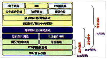 當(dāng)前國內(nèi)IPTV業(yè)務(wù)試點(diǎn)中采用的機(jī)頂盒,包括華為、中興、UT等主流廠商都主要采用了基于DSP架構(gòu)的技術(shù)解決方案,除能滿足點(diǎn)播、直播等標(biāo)清業(yè)務(wù)需求外,還可通過軟件升級(jí),以支持信息瀏覽、簡單的本地/網(wǎng)絡(luò)游戲等增值業(yè)務(wù),基本上可滿足上述業(yè)務(wù)一定規(guī)模用戶商用要求。