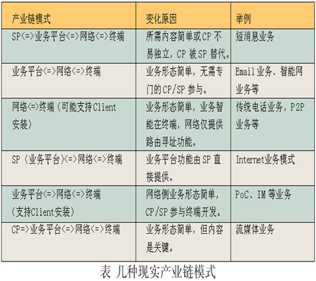 =>網(wǎng)絡< =>終端,而現(xiàn)實中的產(chǎn)業(yè)鏈模式可以通過該模式變化得到,如下表所示。