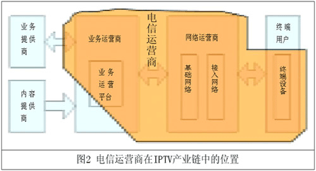 根據(jù)以上的分析,可以看出,電信運營商在IPTV產(chǎn)業(yè)鏈中居于主導地位,但與廣電部門的關系仍然需要理順,才能真正在IP網(wǎng)絡上發(fā)展好視頻類業(yè)務。圖2示意了電信運營商在IPTV中的位置。