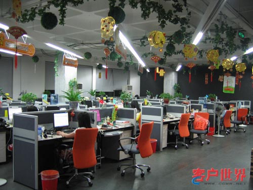 整個(gè)服務(wù)現(xiàn)場(chǎng)的裝修以桔黃色為主色調(diào),代表溫暖、和諧;格局不規(guī)則化,盡顯現(xiàn)代時(shí)尚的風(fēng)格;辦公室到處是綠色植物,墻上貼滿了各種相片、海報(bào)和宣傳語(yǔ),天花板掛滿了激勵(lì)口號(hào)板;別具特色的洗手間文化;乒乓球室、休息室、休閑吧,咖啡機(jī)、茶葉、果汁、雪糕、飲料,魚缸、大液晶電視、音響……一點(diǎn)感覺(jué)不到這是一個(gè)枯燥的呼叫中心的工作環(huán)境。