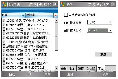 除了向大家介紹的收聽(tīng)資訊外,“聽(tīng)網(wǎng)”還可以根據(jù)用戶的需要播報(bào)短消息及郵件。在選項(xiàng)卡設(shè)置中用戶還可以選擇是否自動(dòng)播放新短信及郵件、郵件接收周期和接收帳號(hào)。