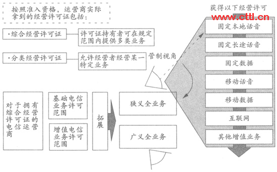 全業(yè)務(wù)可從電信管制、業(yè)務(wù)屬性及市場三個角度進行定義。全業(yè)務(wù)運營則可以從兩個角度來看待,一是從管制視角帶來的狹義全業(yè)務(wù);一是從多業(yè)務(wù)領(lǐng)域與電信結(jié)合的廣義全業(yè)務(wù)。具體表述可參照圖1。