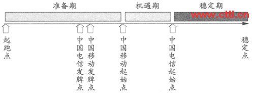 此版本是表示中國移動進入3G業(yè)務(wù)運營早于競爭對手。圖4根據(jù)中國移動和中國電信發(fā)放牌照的不同時期而將全業(yè)務(wù)運營市場策略劃分成準(zhǔn)備期、機遇期和穩(wěn)定期。