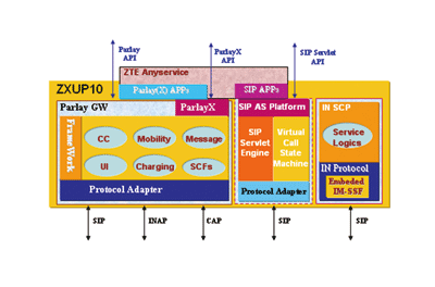 ZXUP10作為開放業(yè)務平臺,包括Parlay網(wǎng)關和SIP應用平臺,對外提供標準的Parlay/ParlayXAPI和SIPServletAPI,屏蔽底層網(wǎng)絡的差異性,第三方通過調用標準接口,快速生成Web等方式的第三方應用,帶來業(yè)務開發(fā)、提供模式的重大改變。