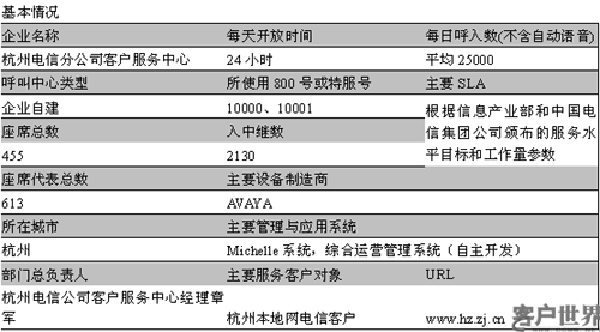 浙江省電信有限公司杭州市分公司客戶服務中心(以下簡稱杭州電信客服中心,或者杭州電信10000號)成立于2002年9月,是一個基于CTI技術、充分利用通信網和計算機網絡的綜合信息服務系統(tǒng),以電話為主,輔之以傳真、短信、Email、互聯(lián)網等多種接觸媒體,通過人工、自助語音與網上服務的方式,為杭州400萬電信客戶提供綜合電信業(yè)務的咨詢、查詢、受理、投訴、報障和電話營銷。建有2130路中繼通道,1410路自動語音通道,186個人工服務座席、189個電話營銷座席、80個外包座席,占地5600多平米,分別位于杭州市惠興路9號和慶春路133號。