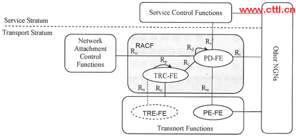 RACF由策略決策功能實體PD-FE和傳送資源控制功能TRC-FE兩個功能實體組成。PD-FE基于網(wǎng)絡(luò)策略規(guī)則、業(yè)務(wù)控制功能SCF提供的業(yè)務(wù)信息、網(wǎng)絡(luò)附著控制功能NACF提供的傳送層簽約信息,以及TRC-FE提供的資源接納決策結(jié)果,做出網(wǎng)絡(luò)資源接納控制的最后決策?梢曰诿總流對傳送層的策略執(zhí)行功能實體。PE-FE下發(fā)資源接納控制策略。TRC-FE負責收集和維護傳送網(wǎng)的拓撲和資源狀態(tài)信息,基于拓撲、連接性、網(wǎng)絡(luò)、節(jié)點資源的可用性以及接入網(wǎng)中的傳送層簽約信息等網(wǎng)絡(luò)信息控制資源的使用,提供傳送網(wǎng)絡(luò)接納控制的決策。PD-FE通過Rt參考點請求TRC-FE檢測或者決定所請求的媒體流路徑上的QoS資源。