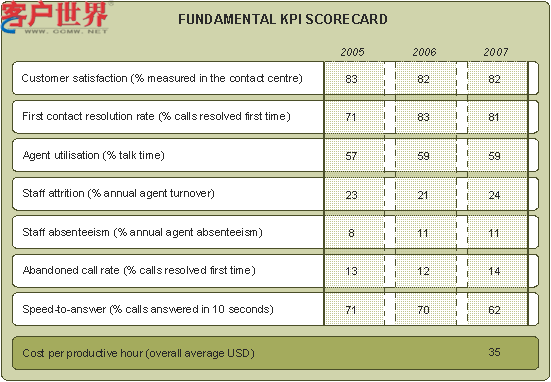 一次問(wèn)題解決率的記分已經(jīng)作為定義和測(cè)量標(biāo)準(zhǔn)擁有了更高的協(xié)調(diào)性,但是人工座席利用率,生產(chǎn)力的代名詞,應(yīng)該受到更多的關(guān)注,因?yàn)樗呛侠硪?guī)劃和管理資源的一個(gè)重要體現(xiàn)。員工離職率測(cè)評(píng)的是平均年流失率,是檢測(cè)人力資源管理效率的一項(xiàng)重要指標(biāo)。除了像處理今年24%的流失率所付出的高成本和努力外,客戶服務(wù)的間接成本也是值得注意的。員工曠工對(duì)企業(yè)來(lái)說(shuō)是無(wú)法計(jì)算的損失。注重激情,提高滿意度和激發(fā)員工的主動(dòng)性是解決這項(xiàng)問(wèn)題的關(guān)鍵點(diǎn)。電話放棄率統(tǒng)計(jì)顯示有十分之一的來(lái)電者會(huì)放棄再次來(lái)電,因此呼叫中心要滿足客戶的期望還有很長(zhǎng)的路要走。接聽速度的記分統(tǒng)計(jì)中10秒的接聽記錄有所下降,但是20秒的接聽標(biāo)準(zhǔn)有整體的提高。生產(chǎn)小時(shí)成本是計(jì)算提供特定服務(wù)實(shí)際成本的標(biāo)準(zhǔn)尺度,同時(shí)也是了解呼叫中心每個(gè)生產(chǎn)小時(shí)所需的投資成本的重要依據(jù)。