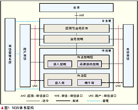 NGN基于IP技術(shù),采用業(yè)務(wù)層和傳送層相互分離、應(yīng)用與業(yè)務(wù)控制相互分離、傳送控制與傳送相互分離的思想,能夠支持現(xiàn)有的各種接入技術(shù),提供話音、數(shù)據(jù)、視頻、流媒體等業(yè)務(wù),并且支持現(xiàn)有移動網(wǎng)絡(luò)上的各種業(yè)務(wù),實(shí)現(xiàn)固定網(wǎng)絡(luò)和移動網(wǎng)絡(luò)的融合,此外還能夠根據(jù)用戶的需要,保證用戶業(yè)務(wù)的服務(wù)質(zhì)量。NGN的網(wǎng)絡(luò)體系架構(gòu)如圖1所示,