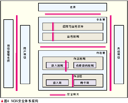 為了給網(wǎng)絡(luò)運(yùn)營商、業(yè)務(wù)提供商和用戶提供一個安全可信的網(wǎng)絡(luò)環(huán)境,防止各種攻擊,NGN需要避免出現(xiàn)非授權(quán)用戶訪問網(wǎng)絡(luò)設(shè)備上的資源、業(yè)務(wù)和用戶數(shù)據(jù)的情況,需要限制網(wǎng)絡(luò)拓?fù)浣Y(jié)構(gòu)的可見范圍,需要保證網(wǎng)絡(luò)上傳送的控制信息、管理信息和用戶信息的私密性和完整性,需要監(jiān)督網(wǎng)絡(luò)流量并對異常流量進(jìn)行管理和上報(bào)。
