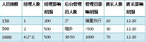 當員工人數(shù)在150人的時候,班長往往有10位左右。經(jīng)理能有足夠的精力來兼顧全局,甚至和大部分員工認識,親自制定關(guān)鍵流程和制度,參與每次的重要信息傳達。那么這個時候,經(jīng)理無疑是最為重要的管理者。班長是第二重要的,后臺管理員(質(zhì)檢、維護、投訴處理、綜合行政等)就更多是個執(zhí)行角色。