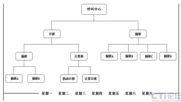 日班人員可分為:正常班和插班。其中,可根據(jù)呼叫中心規(guī)模和工作量,正常班可分為正常日班和機(jī)動(dòng)日班,插班可拆分為兩組人員。
