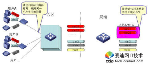 考慮到業(yè)務特性,上網業(yè)務通常需要對用戶進行精細化管理,而對IPTV業(yè)務通常采用較粗獷的管理模式,因此我們建議通過如下方式來做VLAN規(guī)劃:對上網業(yè)務,采用PUPV(每用戶一VLAN),對于IPTV/VOIP業(yè)務,采用PSPV(每業(yè)務一VLAN),即同一園區(qū)內的IPTV用戶采用同一VLAN,不同園區(qū)的IPTV/VOIP用戶采用不同的業(yè)務VLAN,在局端,通過靈活QINQ對上網業(yè)務的VLAN打外層標簽,對于IPTV業(yè)務的VLAN不打外層標簽。