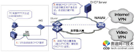 當網絡設備收到STB的DHCP請求報文時,需要在報文后添加OPTION82字段,此時有兩種模式進行DHCP+認證,一種是直接把DHCP報文送給DHCP服務器,由DHCP服務器根據(jù)OPT82字段來判斷該用戶是否為合法用戶,從而決定是否為其分配IP地址。另一種是DHCP報文先送到BRAS,由BRAS將OPT82字段放到RADIUS的一個子域里,通過RADIUS服務器來進行用戶合法性認證,若用戶合法,再由DHCP服務器分配IP地址。