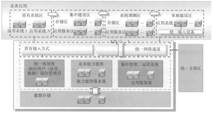 。5)應(yīng)用業(yè)務(wù)區(qū):統(tǒng)一搭建應(yīng)用硬件平臺(tái),實(shí)現(xiàn)應(yīng)用業(yè)務(wù)區(qū)業(yè)務(wù)應(yīng)用及業(yè)務(wù)能力提供區(qū)接入通道類型的新增,均可直接在其硬件平臺(tái)上加載應(yīng)用軟件、提供服務(wù),調(diào)用現(xiàn)有資源實(shí)現(xiàn)。個(gè)別因?yàn)橄到y(tǒng)本身需求需要單獨(dú)建設(shè)、部署的系統(tǒng)則保留其單獨(dú)建設(shè)的方式。